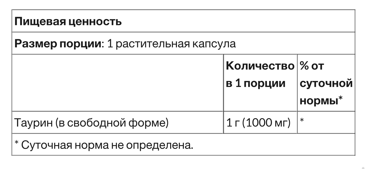 Таурин — условно незаменимая аминокислота, которая не используется для синтеза белка, однако главным образом обнаруживается в свободной форме в большинстве тканей, особенно в нервной системе. Этот элемент стабилизирует клеточные мембраны тканей, облегчая процесс перемещения калия, натрия, кальция и магния в клетках и за их пределами. Таурин способствует генерации и регуляции нервных импульсов, а также обеспечивает поддержку нормального водного баланса. Кроме того, эта аминокислота используется в зрительных путях, а также в мозговой и нервной системах, где совместно с глицином и ГАМК выступает в роли нейромедиатора.Данный продукт содержит в 2 раза больше таурина (1000 мг), чем продукт обычного действия (500 мг), созданный нашей компанией.Рекомендации по применениюПринимать по 1 капсуле 1–2 раза в день, запивая соком или водой, желательно между приемами пищи.