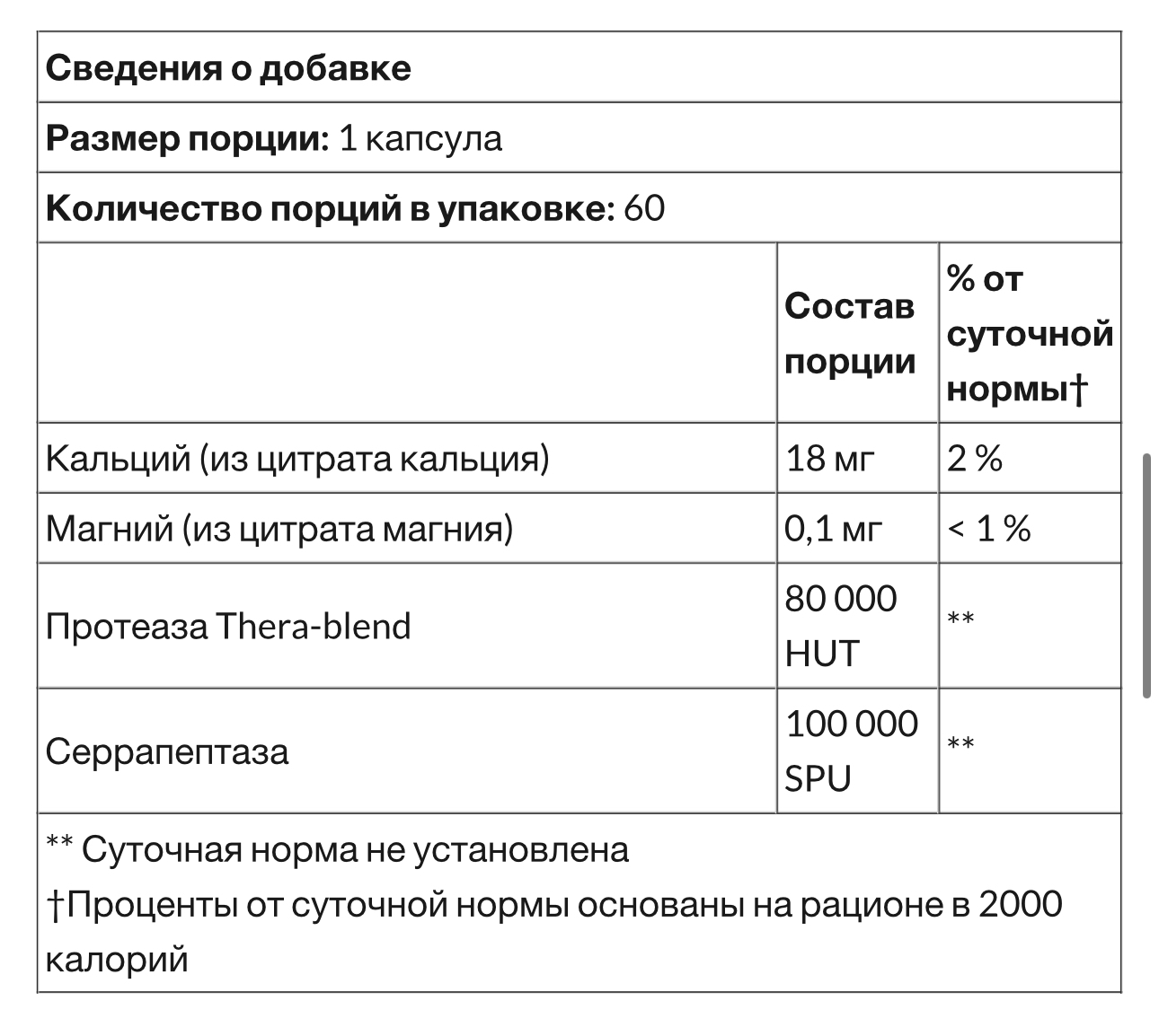 SerraGold™ содержит высокоэффективную серрапептазу в сочетании со смесью протеолитических ферментов, поддерживающих здоровье опорно-двигательного аппарата, иммунную функцию, здоровье сердечно-сосудистой системы, придаточных пазух носа, а также общее здоровье организма. Веганская серрапептаза в SerraGold устраняет необходимость в использовании кишечнорастворимой оболочки.