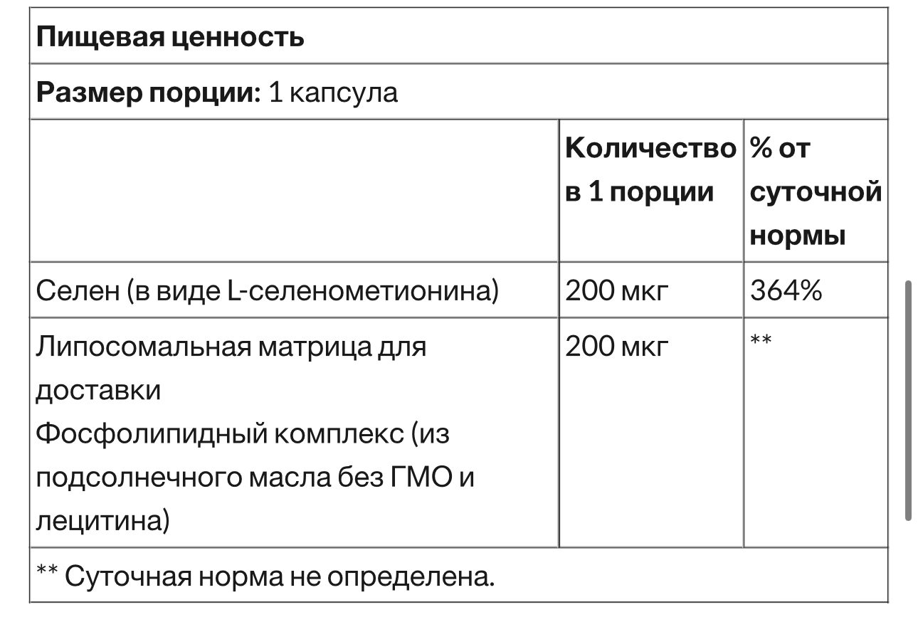 Ежедневная добавка Codeage Liposomal Selenium содержит 200 мкг микроэлемента селена в виде L-селенометионина на порцию и содержит фосфолипидный комплекс в виде простых в использовании капсул, содержащих всего 1 таблетку селена в день. Рекомендации по применению Принимать по 1 капсуле в день, запивая 240 мл (8 унциями) воды или любимого напитка. Можно принимать независимо от приема пищи. Ингредиенты Метилцеллюлоза. Данный продукт производится на предприятии, где обрабатываются рыба и древесные орехи. Искусственных красителей и ароматизаторов Без консервантов. Не содержит дрожжей, крахмала и глютена. Предупреждения Не следует превышать рекомендуемую дозу. Перед применением этой или любых других пищевых добавок беременные или кормящие матери, а также лица с диагностированным заболеванием должны проконсультироваться с врачом. Будьте осторожны, если у вас аллергия или чувствительность к любому из перечисленных ингредиентов. Не предназначено для лиц младше 18 лет. Хранить в сухом и прохладном месте. Не используйте, если продукт был вскрыт или поврежден. Хранить в недоступном для детей и домашних животных месте.