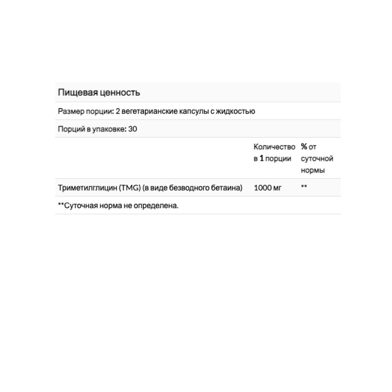 Более 50 лет исследований. Триметилглицин известен как полезное для сердца аминокислотное соединение с 1950-х годов. Это более чем 50 лет научных исследований, на которые можно положиться. Информация о продукте Триметилглицин (TMG) также называют глицин-бетаином, но название триметилглицин означает, что он имеет три метиловые группы, присоединенные к каждой молекуле глицина. Пшеничные отруби являются основным пищевым источником TMG, а в других злаках он содержится в меньшем количестве. TMG также может производиться в организме из холина, важного питательного вещества, содержащегося в яйцах, соевых бобах и многих других продуктах. Польза TMG для здоровья сердца была обнаружена в 1950-х годах. Подобно некоторым витаминам группы B (B6, B12 и фолат), TMG является источником метила, обеспечивая дополнительные метиловые группы, чтобы ускорить обратное превращение гомоцистеина в метионин. Когда метиловая группа TMG передается молекуле гомоцистеина, она превращает ее в нетоксичную аминокислоту метионин. Роль TMG в нормальном метаболизме гомоцистеина еще более важна, когда в организме низкий уровень витамина B. Некоторые данные свидетельствуют о том, что TMG может быть более эффективным в регулировании уровня гомоцистеина, чем фолат. Исследования, демонстрирующие способность TMG обеспечивать нормальный уровень гомоцистеина, уже находящийся в пределах нормы, отдельно или в сочетании с другими питательными веществами, подтверждают его статус важного питательного вещества для сердечно-сосудистой системы и здоровья в целом. TMG был связан с нормальным артериальным давлением и работой митохондрий, и было обнаружено, что он связан со здоровьем сердечно-сосудистой системы. TMG также способствует нормальной работе печени. Исследования показывают, что TMG помогает справляться с воспалением, подавляя экспрессию NFkappaB, TNF-альфа и других воспалительных белков, что может частично объяснять его положительное влияние. Поскольку кишечные микробы могут производить различные побочные продукты из TMG, здоровье микрофлоры кишечника влияет на эффекты TMG в организме. Рекомендации по применению Перед применением внимательно изучите информацию на этикетке и строго следуйте рекомендациям. Принимать две (2) капсулы утром или по назначению лечащего врача. TMG следует принимать с кофакторами B6, B12 и фолиевой кислотой.