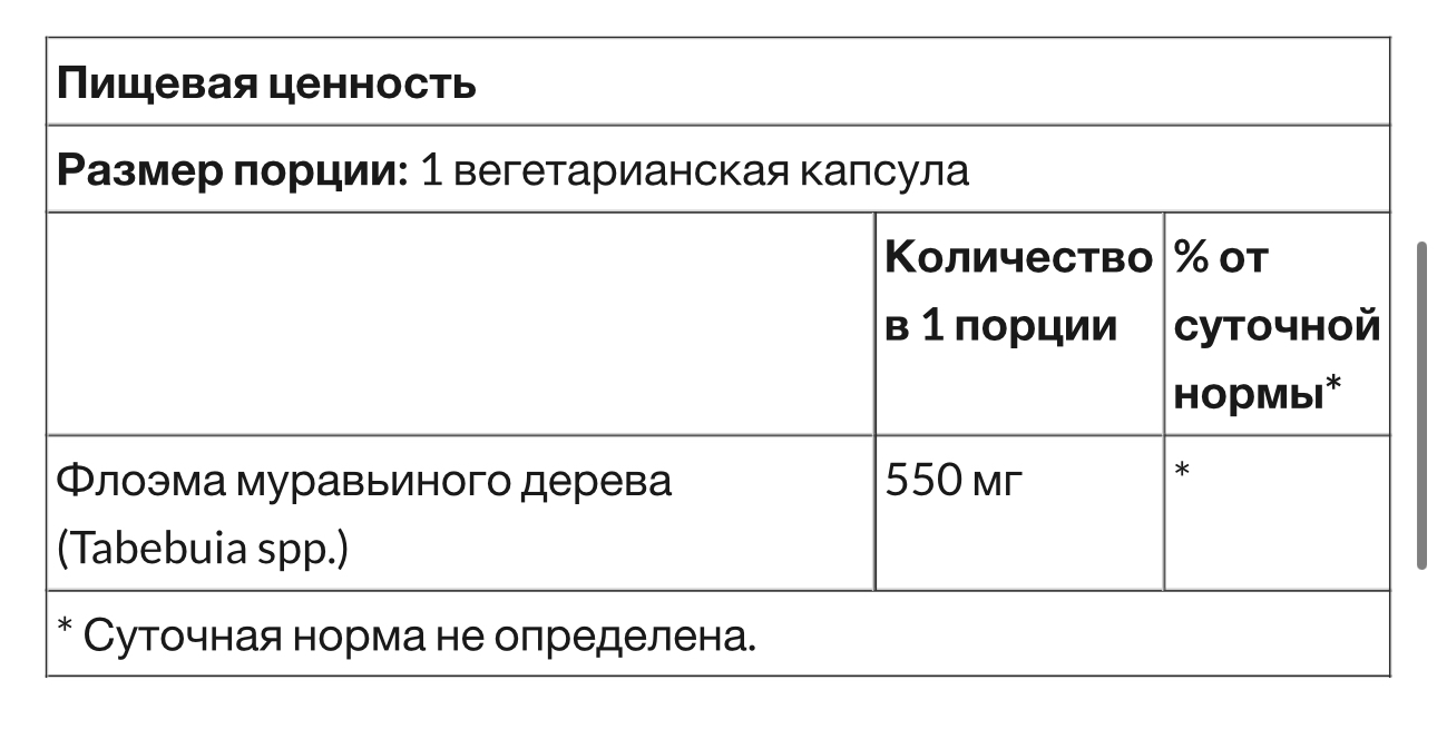 Описание. Муравьиное дерево, также известное как лапачо, — это цветущее дерево, произрастающее в Бразилии и других странах Южной Америки. Оно используется коренными племенами более 1500 лет и высоко ценится за общую пользу для здоровья. Муравьиное дерево оказывает антиоксидантную поддержку и традиционно используется для нормальной работы иммунной системы.