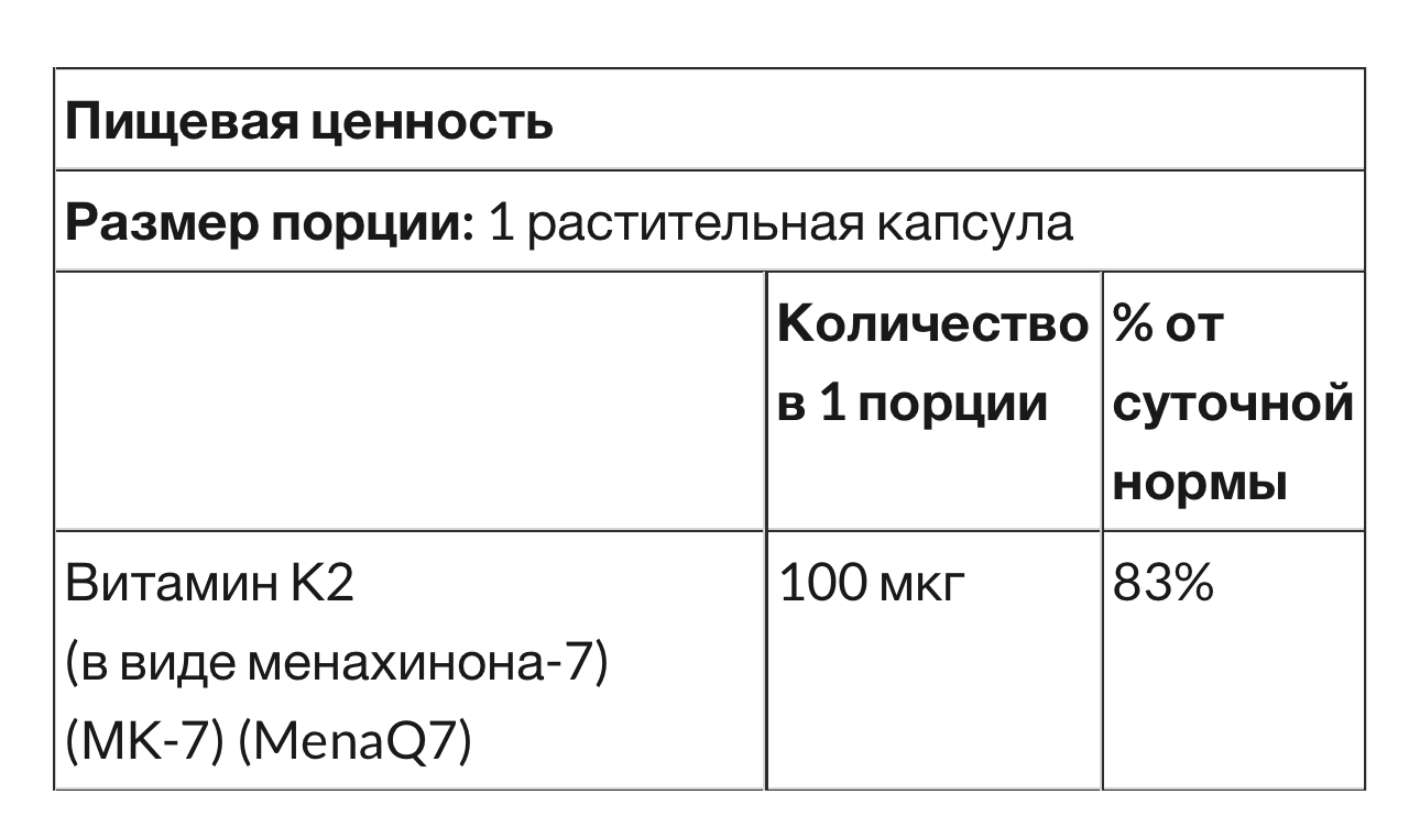 Известно, что витамин К отвечает за синтез нескольких факторов свертывания крови и формирование сильных, здоровых костей. MenaQ7® MK-7 — это уникальная биодоступная форма витамина К2 без сои, которая играет ключевую роль в поддержании здоровья артерий благодаря своей способности обеспечивать правильный обмен кальция в кровеносных сосудах и артериях.