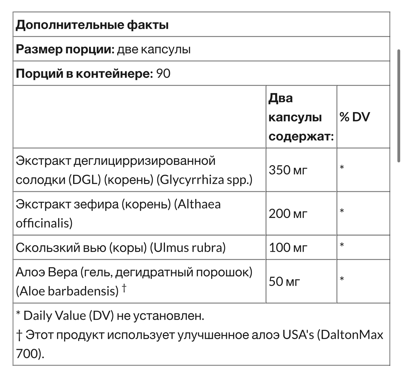 Хотя алоэ вера обладает значительной гастропротекторной эффективностью, некоторые формы алоэ вера могут оказывать слабительное действие. Ингредиент алоэ вера от GI Relief поступает из внутреннего филе растения алоэ вера, что позволяет избежать этого эффекта. Точно так же препараты корня солодки, поддерживающие работу желудка и двенадцатиперстной кишки, могут вызвать повышение артериального давления у некоторых людей при приеме в больших количествах. Поэтому из солодки в GI Relief удален глицирризин, который предотвращает повышение артериального давления. GI Relief также содержит кору скользкого вяза (Ulmus rubra) и корень алтея (Althea officinalis), которые содержат слизистые компоненты, успокаивающие пищеварительный тракт. Чтобы снять раздражение пищевода, GI Relief можно вынуть из капсулы и смешать с теплой водой и выпить в виде чая. Рекомендации по применению Принимать 1-2 капсулы во время еды или по указанию врача. Ингредиенты Гипромеллоза (полученная из целлюлозы), лейцин, диоксид кремния. Предупреждения Контроль вскрытия: Использовать только в случае целостности упаковки. Хранить упаковку плотно закрытой в сухом прохладном месте. Не принимать при беременности.