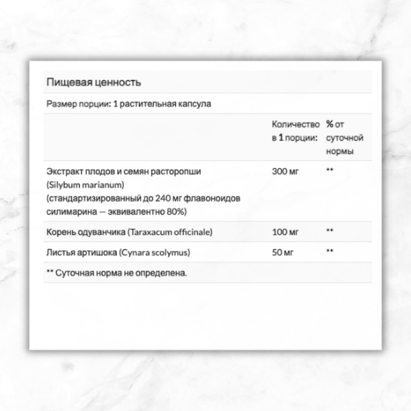 Расторопша веками использовалась традиционными травниками. Научные исследования показали, что расторопша может помочь в поддержании здоровой функции печени. Это вегетарианское средство также содержит артишок и одуванчик для дополнительной поддержки. Рекомендации по применению Принимать по 1 капсуле 1–3 раза в день. Ингредиенты Гипромеллоза (целлюлозная капсула), микрокристаллическая целлюлоза, диоксид кремния и стеарат магния (растительного происхождения). При производстве не используются дрожжи, пшеница, глютен, соя, молоко, яйца, рыбы, моллюски, древесные орехи или кунжут. Производится на предприятии, имеющем регистрацию надлежащей производственной практики (GMP), где обрабатываются другие ингредиенты, содержащие эти аллергены. Силимарин двойной силы от NOW содержит в два раза больше экстракта расторопши (300 мг в одной капсуле), чем наш продукт с обычной силой действия (150 мг в одной капсуле). Предупреждения Предупреждение. Только для взрослых. Если вы беременны, кормите грудью, принимаете лекарства или у вас есть заболевания, проконсультируйтесь с врачом. Хранить в недоступном для детей месте. Продукт может естественным образом менять цвет. После вскрытия упаковки хранить в сухом и прохладном месте.