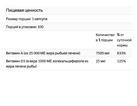 Капсулы Bluebonnet содержат витамин А и витамин D3 (холекальциферол), которые способствуют здоровому зрению и крепкому иммунитету. Их получают из жира печени глубоководных, холодноводных рыб путем молекулярной дистилляции.