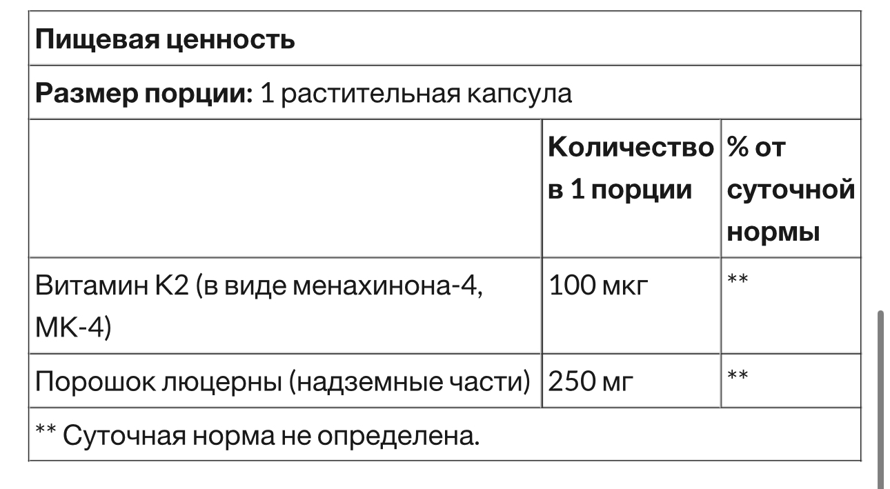 Роль витамина K в обеспечении нормальной свертываемости крови известна очень давно, сегодня мы уже знаем и о его значении для поддержания здоровья костей, сердечно-сосудистой и нервной системы. Витамин К 2 — это биологически активная форма витамина K, играющая важную роль в формировании здоровой и крепкой костной системы. Роль витамина K в поддержании здоровья артерий связана с тем, что он способствует нормальному обмену кальция в сосудах.Описание