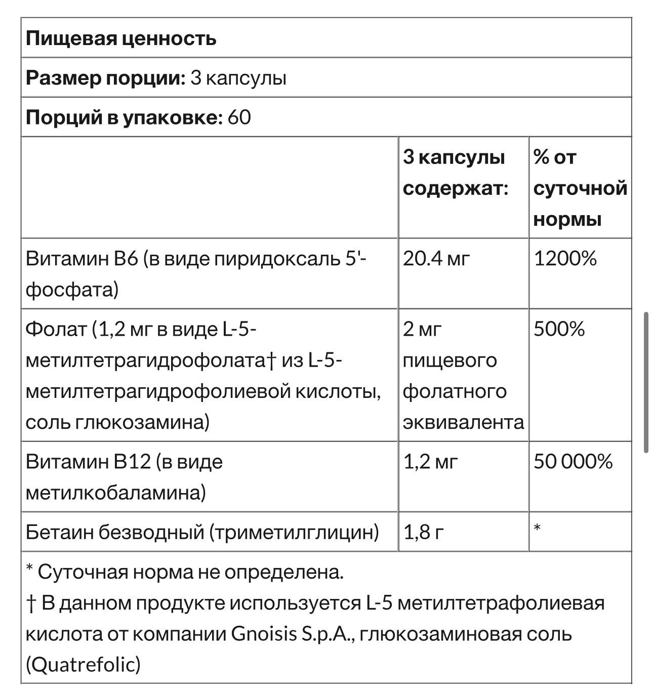 Поддерживает процесс метилирования, необходимый для здоровья сердца, кровеносных сосудов, мозга и костей.