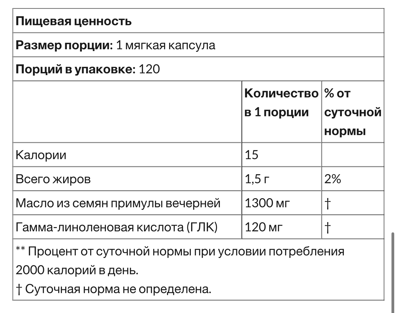 Масло примулы вечерней SR® производится методом холодного отжима из семян примулы вечерней и содержит 120 мг гамма-линоленовой кислоты (ГЛК) в 1 порции.